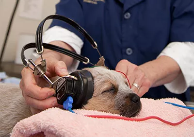 When it comes to testing the hearing of animals, a brainstem auditory evoked response (BAER) is completed to determine hearing sensitivity. Numerous breeds of dogs “experience genetically related deafness”, and even experience hearing loss due to age and noise exposure. (cahs.uc.edu)