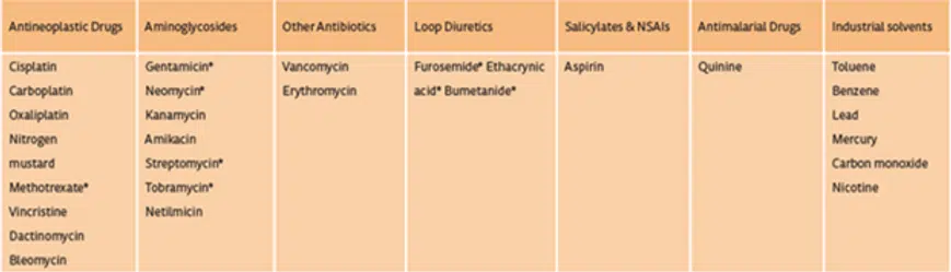 There are over 200 prescription and OTC medications that are potentially ototoxic (see table below). However, the most well-established categories of drugs commonly associated with permanent irreversible damage to hearing and/or balance are antineoplastic agents such as cisplatin, and aminoglycoside antibiotics such as gentamicin, tobramycin, and amikacin.